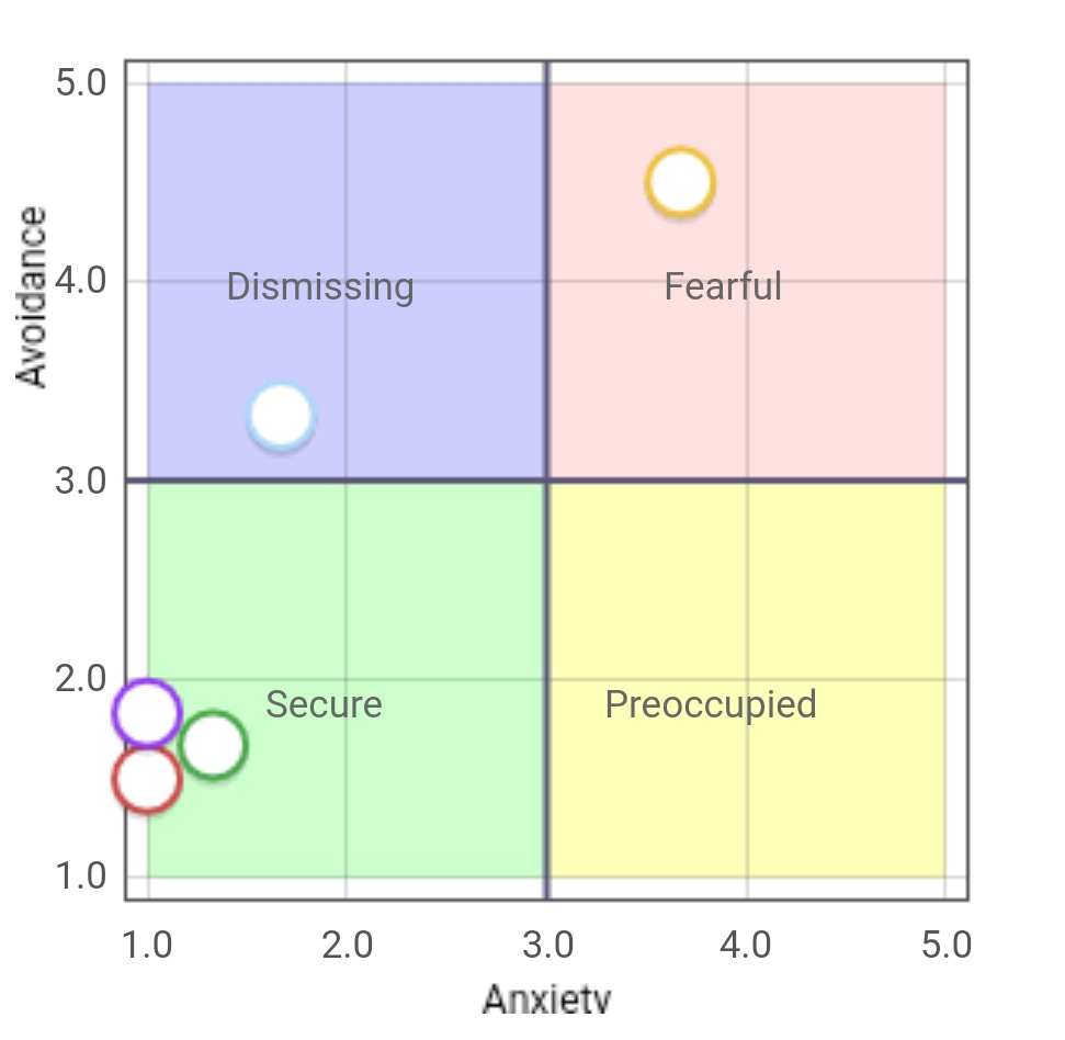 These are my actual results, from taking the test here, with my attachment to different people being represented by different circles. The circles in the avoidant area of the chart represent my oldest attachments, with my newer relationships clustered in the stable quadrant. Back when attachment theory was dreamed up, it was thought that a child would have a single attachment style based on the relationship they had with their mother. What I take from my results is that just isn’t true. My attachment style has changed over time, and I now make healthy attachments to the people in my life. Looking at this graph, I realized what was going on with all the other personality tests I’d taken through the years.